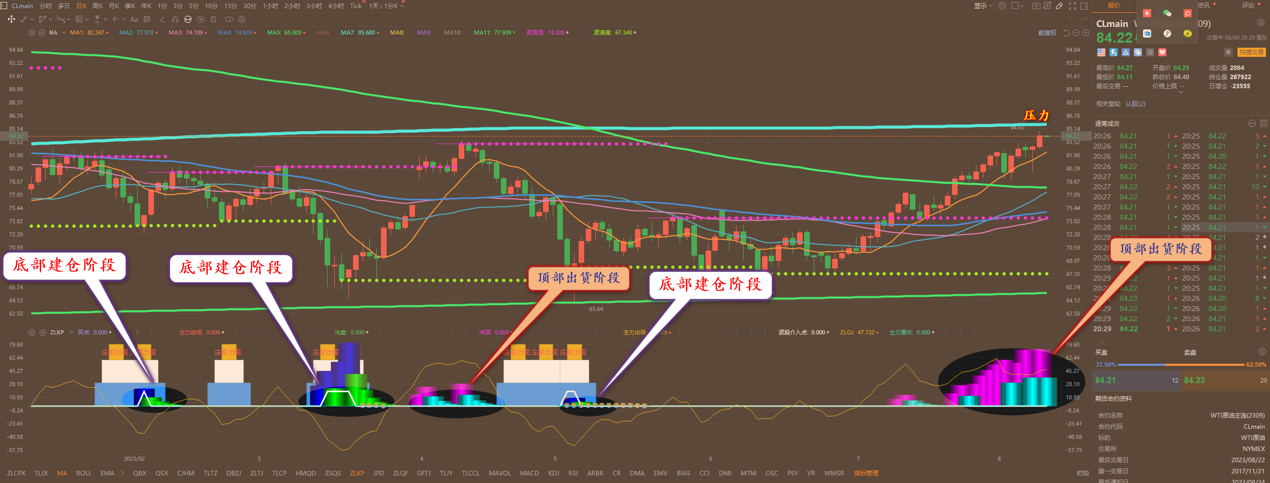 通过对黄金日线图解析得知,昨日行情继续延续上涨走势晚间再次创新高,我们从下方幅图可以清楚地看到行情之所以会出现上涨以及回调在每次的阶段性底部区域都出现了多头主力布局建仓的信号,到达顶部区域出现了出货动作,目前已经再次出现顶部区域出货信号,多头主力资金流入的速度明显减缓,短期上方我们重点关注84.70和
