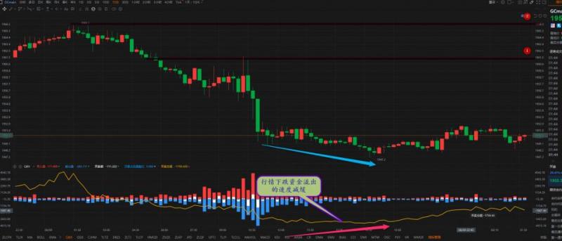 通过对黄金15分钟图解析得知,昨日晚间下跌到达下方1913一线有所止跌反弹,我们从下方的附图可以清楚的看到到达底部区域资金流出的速度有所减缓,目前从早盘到目前为止依然是处于横盘震荡期间有部分资金进仓,预计将会小幅反弹一波,短期上方我们重点关注12号的压力位即可,在操作上我们继续高空低多思路,具体建议参考