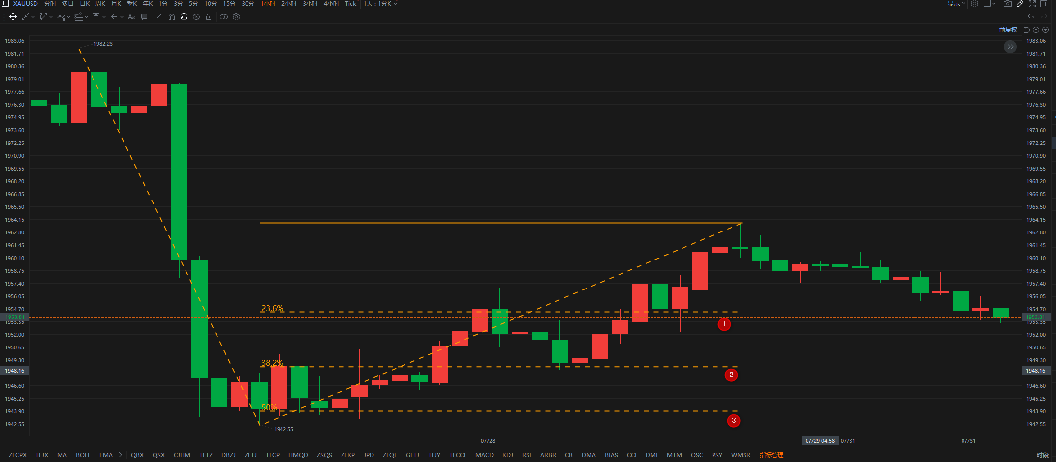 通过对黄金小时图解析得知,昨日行情继续延续下跌走势,晚间到达上周的低点位附近下方再次出现了绝地反击信号目前有所反弹,上方我们继续关注1958和1969以及1981一线的压力即可,短期下方我们继续关注1931和1941的支撑即可,行情将会继续进行宽幅震荡运行,在操作上我们继续高空低多思路思路,具体建议如下: 激进