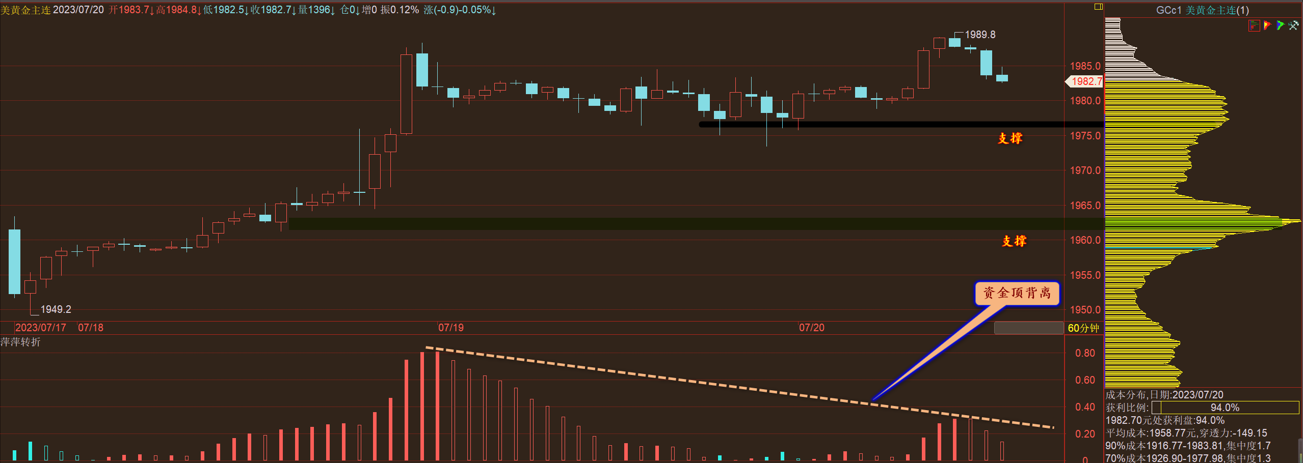通过对黄金小时图解析得知,黄金从早盘到目前为止冲高回落在上方1985一线的压力没有出现放量动作,冲高回落属于正常现象,我们从下方的附图可以清楚的看到目前已经出现资金顶背离迹象,说明行情非常有可能继续回落短期下方我们关注1971和1958的支撑即可,在操作上我们继续高空低多思路,具体建议参考上午的策略即可