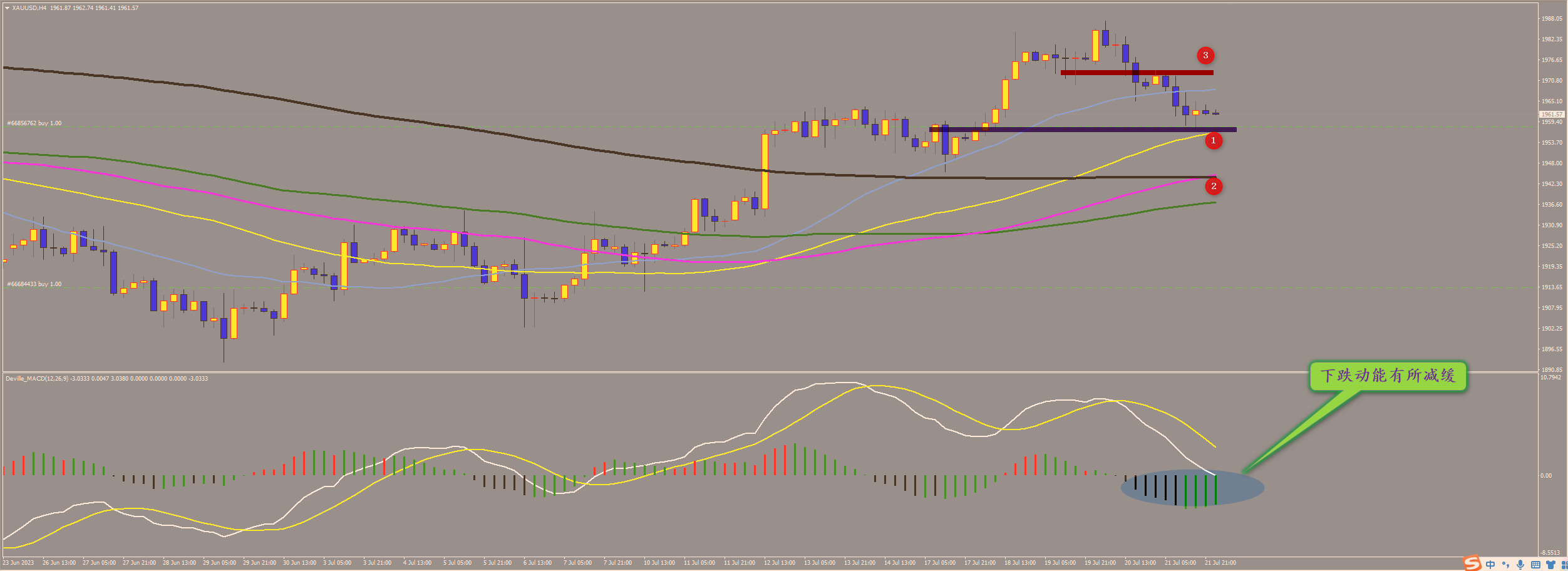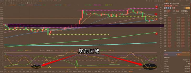 通过对黄金小时图解析得知,昨日行情先涨后跌,在1号的支撑位小幅反弹一波到达上方1968一线冲高回落下半夜跌破下方1956的支撑,目前呈现弱势盘整状态,上方1号支撑位短期已经成为关键压力位,除非今日盘中放量突破并且站上,否则将会继续下探到23号的支撑位,我们从下方的幅图也可以清楚地看到短期已经连续出现底部信号