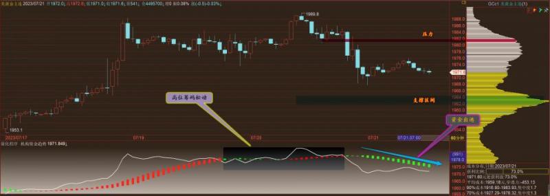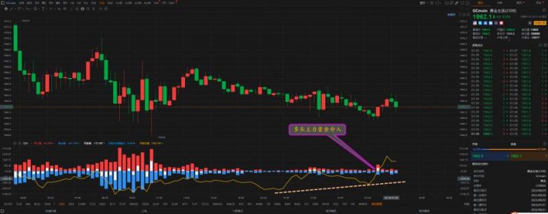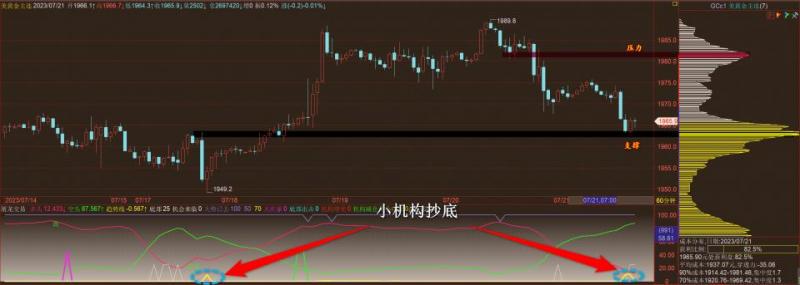 通过对黄金小时图解析得知,黄金下午如期冲高回落到达下方1961一线的支撑位(1962-1958的区间支撑)相对而言也是有一定的支撑作用的,我们通过下方的附图可以清楚的看到到达支撑位出现了小机构抄底信号,前期在底部区域出现抄底信号的时候都进行了一波不错的反弹短期是否我们重点关注1980一线的关键压力位即可,在操作上