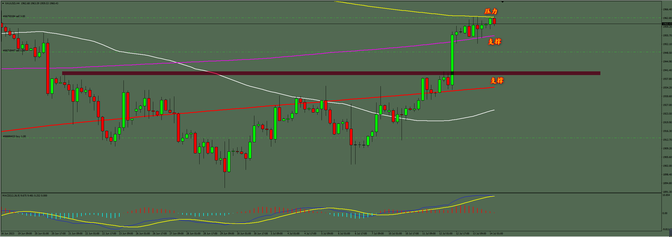 通过对黄金4小时图解析得知,黄金从早盘到目前为止继续在高位窄幅震荡调整运行上方连续2个交易日在均线的位置受阻回落,我们从下方的ACD也可以清楚地看到红色的多头能量柱有缩短迹象说明短期有调整需求,短期下方关注一下下方1954一线的均线支撑一旦放量跌破就会到达下方1940一线的支撑,重点是美盘时间段的力道,盘整随