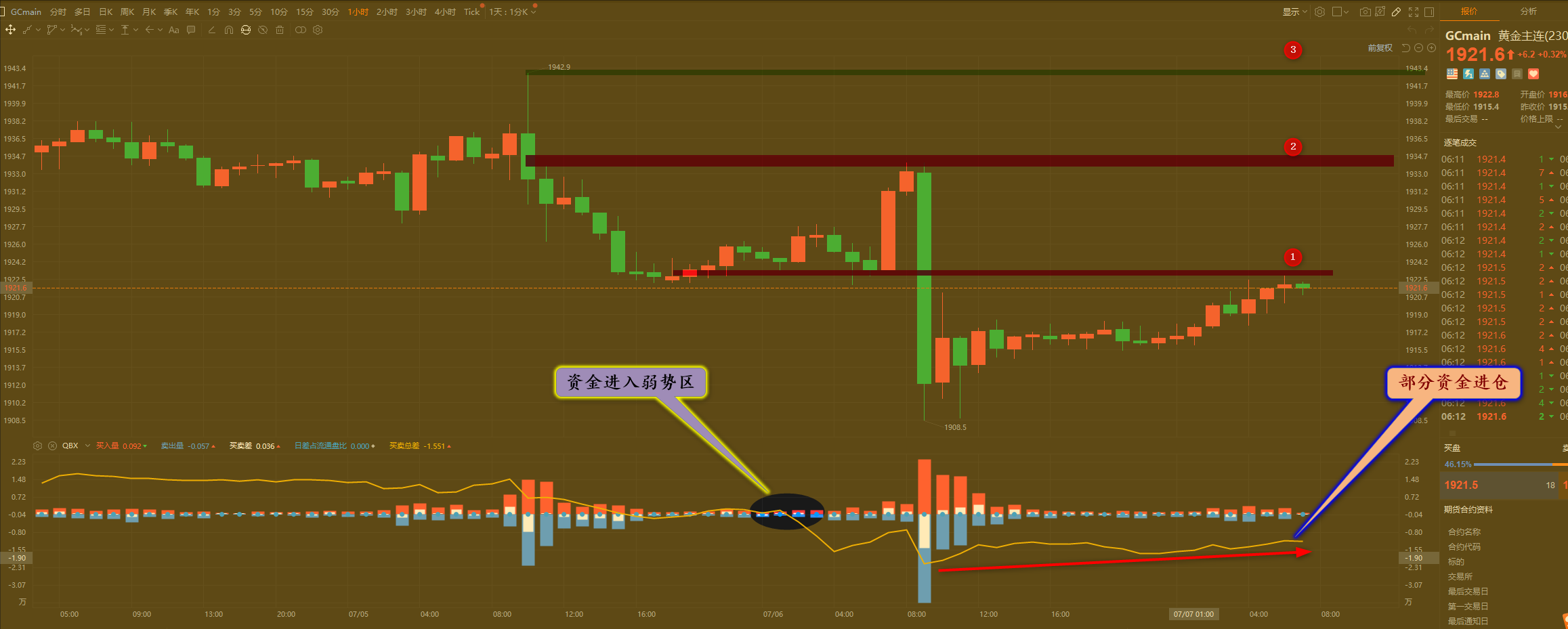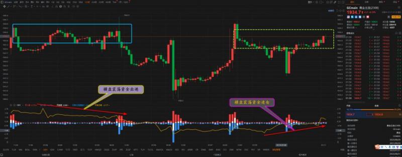 通过对黄金小时图解析得知,黄金从早盘一路向上反弹目前即将再次到达上方1931的压力位,从我们从下方的附图可以清楚的看到,在前期高位横盘震荡区间多头主力资金有出逃迹象从而导致行情的回落,目前再次在高位横盘震荡调整期间我们发现多头主力资金有进仓的迹象说明行情有向上突破的迹象,上方我们继续关注1931和1935以