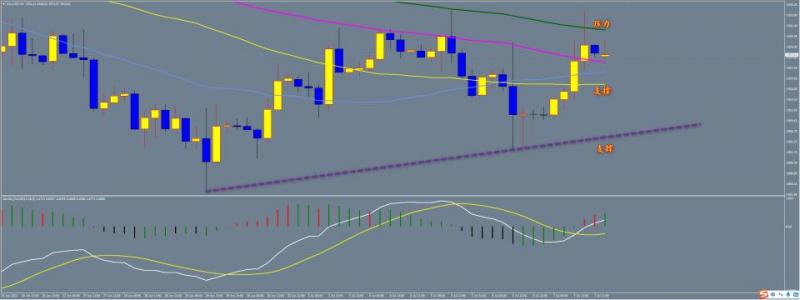 通过对黄金4小时图解析得知,黄金自从昨日晚间在下方出现了止跌反弹动作目前依然反弹中,从下方的ACD来看短期昨天已经进入零轴下方运行目前属于反弹阶段,虽然下方出现双针探底信号但是均线系统依然空头排列状态上方依然受制于均线的压制是否我们重点关注12号均线的压制即可,整体依然还是处于震荡区间当中运行,在操作