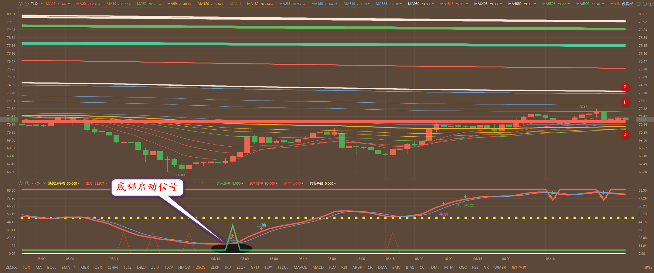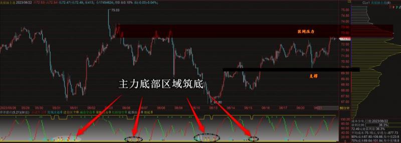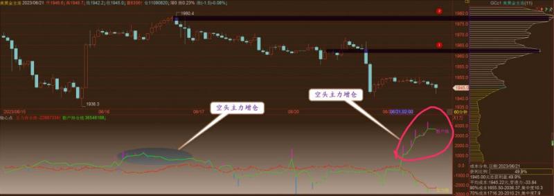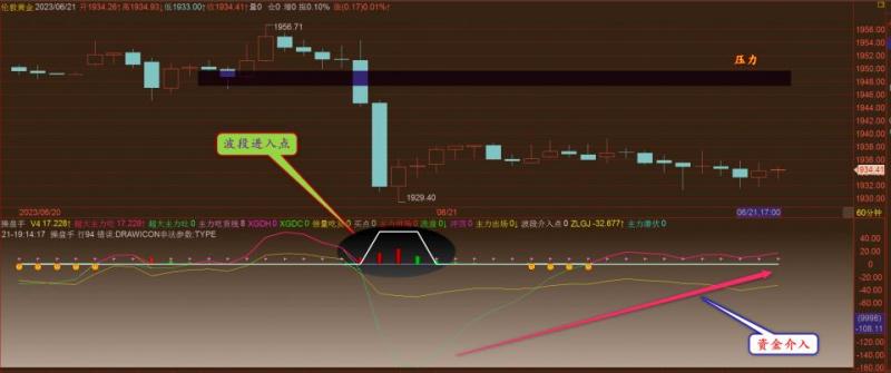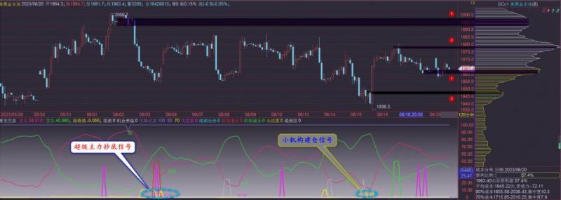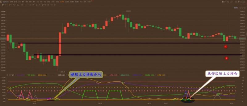 通过对黄金小时图解析得知,黄金早盘一路震荡下行如期到达下方1945一线的支撑(1号支撑)止跌反弹,我们从下方的附图可以清楚的看到上周在下方1925一线出现了超级主力抄底信号行情一路震荡上行虽然短期两天一路调整我们预期的调整点位也已经到达,目前在下方这次出现小机构在底部区域增仓信号,说明行情即将要再次反弹一