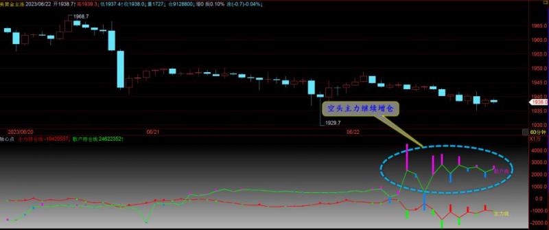 通过对黄金小时图解析得知,黄金从早盘到目前为止一直弱势盘整非常明显反弹动力有些不足,自从昨日下午发现空头主力增仓以来昨日晚间盘中急速下跌,今日我们再次发现空头主力继续增仓说明晚间行情将会继续进一步的下跌,下方我们继续重点关注1920和910以及1901的支撑即可,上方1938和1948依然是压力,在操作上我们继续重