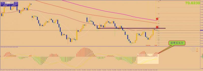 通过对原油4小时图解析得知,昨日行情在下方68.10附近止跌反弹晚间一度到达上方71.00附近(1号压力位)同时也是前期的底部压力位,我们从下方的ACD也可以清楚的看到整体依然是在零轴下方运行只是开始上穿零轴非常有可能再次突破继续震荡上行,短期下方我们重点关注69.70和68.40的支撑,上方我们重点关注12号的一两节课,