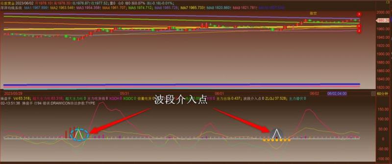 通过对黄金小时图解析得知,黄金从早盘到目前为止在高位窄幅震荡调整到达上方3号均线压力位受阻回落行情之所以会出现这一波的上涨我们从下方的附图可以清楚的看到从1931的位置出现了波段介入信号在昨日1953附近同样也是出现了波段介入信号都出现了一波强有力的上涨,目前在高位虽然有部分资金获利减仓动作,短期下方我们