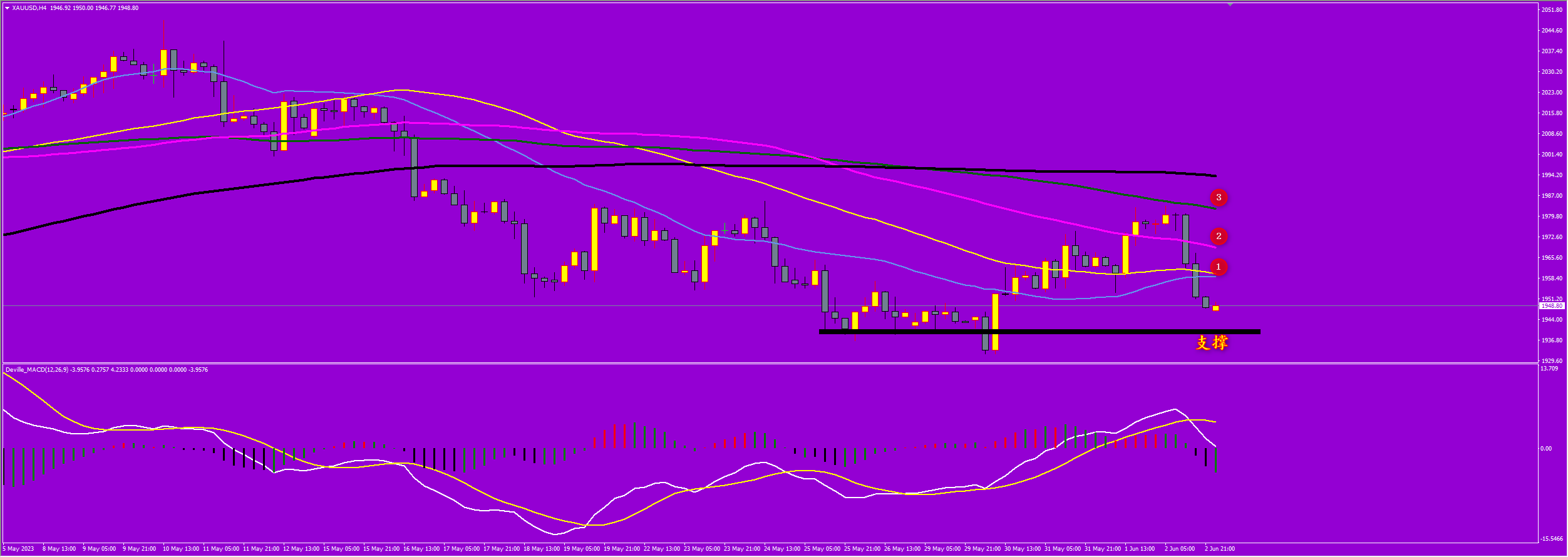通过对黄金4小时图解析得知,上一个交易日受非农数据影响行情直接一路下跌回落到目前现在的位置,在是一个交易日当中就已经说过上方已经接近3号120日均线的压力位附近相对而言也是有一定的压制作用的,星期五晚间再次放量跌破1957一线(1号均线)支撑目前反过来已经成为压力,短期下方我们继续重点关注前期启动突破位1939