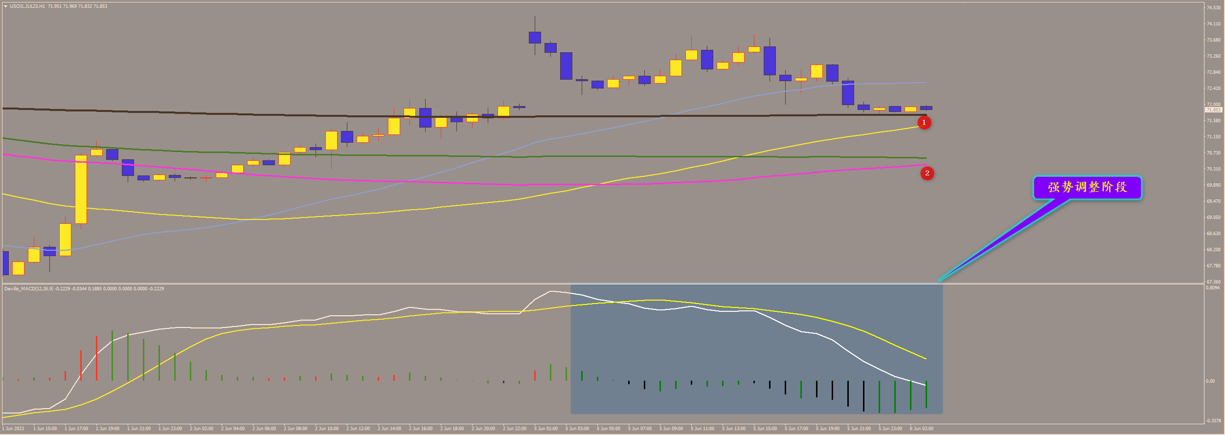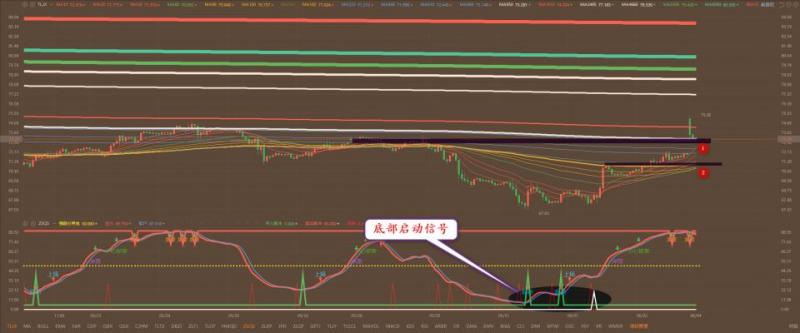 通过对原油小时图解析得知,昨日行情先跌后涨如期在下方70.10附近止跌反弹晚间一度反弹到1号压力位附近冲高回落,我们从下方的幅图也可以清楚地看到前几个交易日在高位形成空头趋势行情一路震荡下行到达下方70.10附近出现了大量的多头主力建仓动作并且形成了多头趋势行情非常有可能进一步的震荡上行突破,短期我们重点关