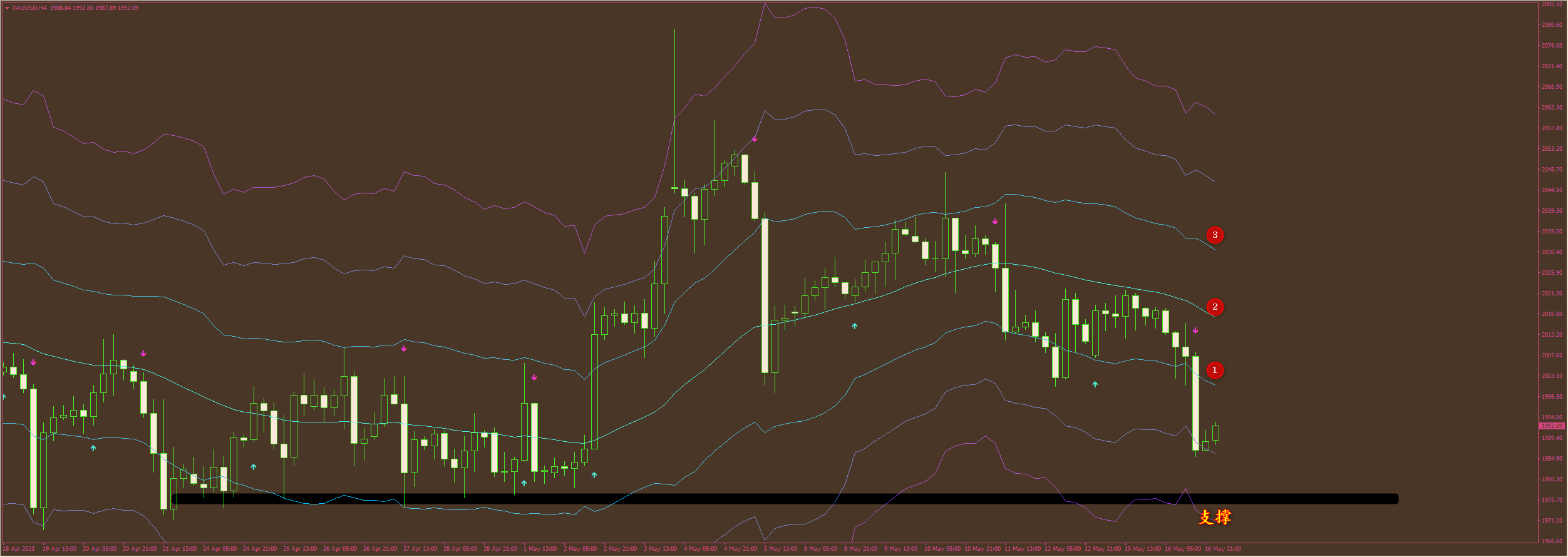 通过对黄金4小时图解析得知昨日行情如期下跌形成一个诱空动作,晚间在下方1985一线止跌反弹,从昨日的运行的走势来看反弹到上方2号轨道线附近受阻回落晚间放量跌破1号轨道线目前反过来上方的轨道已经成为压力位,短期依然是受前期1970-1980震荡区间的强支撑依托,短期继续震荡调整的可能性比较大,短期在操作上我们继续