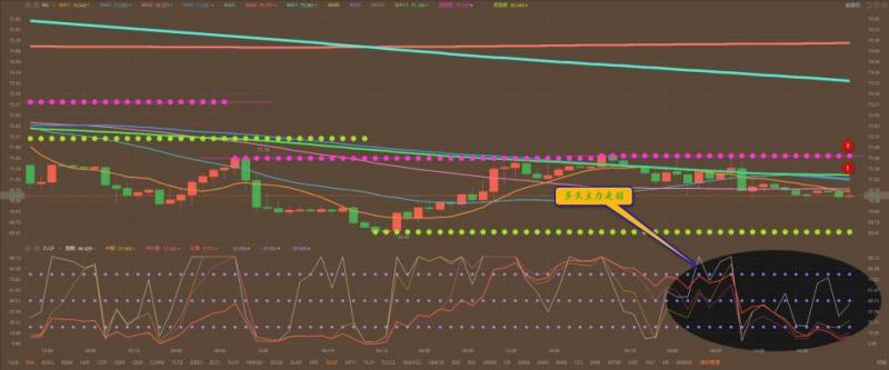 通过对原油小时图解析得知,昨日行情如期冲高回落再次到达上方71.80一线受阻回落晚间在下方70.40一线出现止跌现象,行情之所以会出现冲高回落动作,我们从下方的附图可以清楚的看到多头主力资金已经不能再次回归强势状态晚间直接回归到弱势区运行,目前依然是处于弱势状态短期上方均线压力(1号压力)以及上方2号压力,