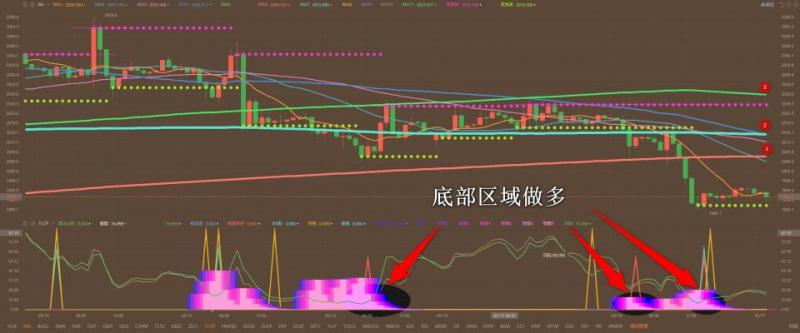 通过对黄金小时图解析得知,行情从早盘小幅反弹,目前有所回落调整整体窄幅震荡调整,我们从下方的附图可以清楚的看到在底部区域出现了多头主力布局建仓信号以及底部做多信号盘中都进行了小幅反弹动作,目前虽然反弹力度不大,但是不排除美盘时间段先反弹一波到达上方的123号的压力位,下方我们继续重点关注1970-=1980之