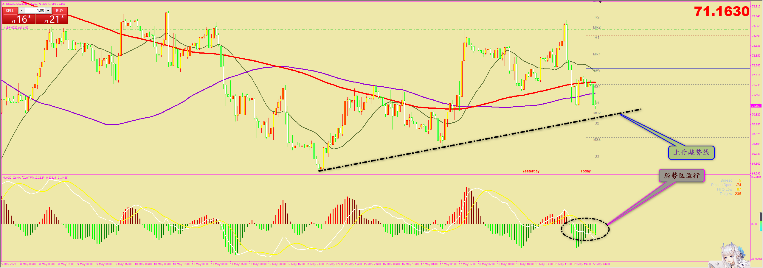通过对原油小时图解析得知,上一个交易日先涨后跌盘中创新高随之一路回落,从下方的ACD星期五的时候明显多头的能量柱呈现顶背离迹象出现冲高回落动作属于正常情况,目前已经在零轴下方运行短期昨天呈现弱势走势但是下方上升趋势线支撑相对而言也是有一定的支撑作用预计短期将会继续窄幅震荡调整,在操作上我们继续高空低