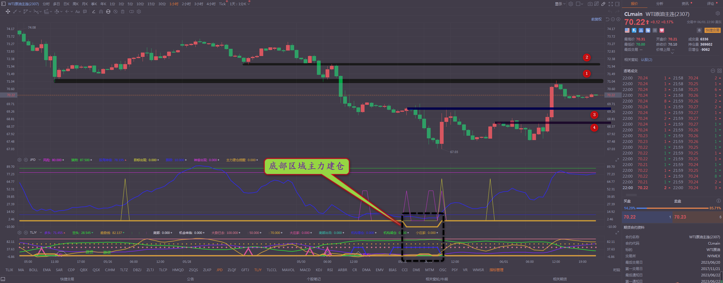 通过对原油小时图解析得知,自从原油在下方67.00一线的底部区域出现多头主力建仓信号昨日横盘震荡晚间受原油库存数据影响拉升突破如期到达上方70.90一线压力位目前有所冲高回落调整短期下方拉升突破34号位已经反过来成为支撑,上方12号前期的底部依然是压力,短期继续震荡上行的可能性比较大一点,短期在操作上我们继续