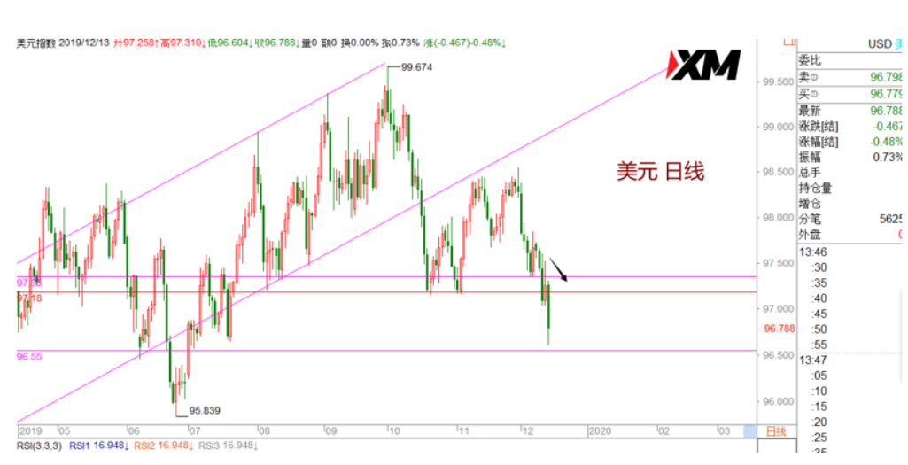 美元日线开始出现指标面的背离,但K线走势上偏空力量较强,日内可关注逢高97.05/97.15试空的机会。