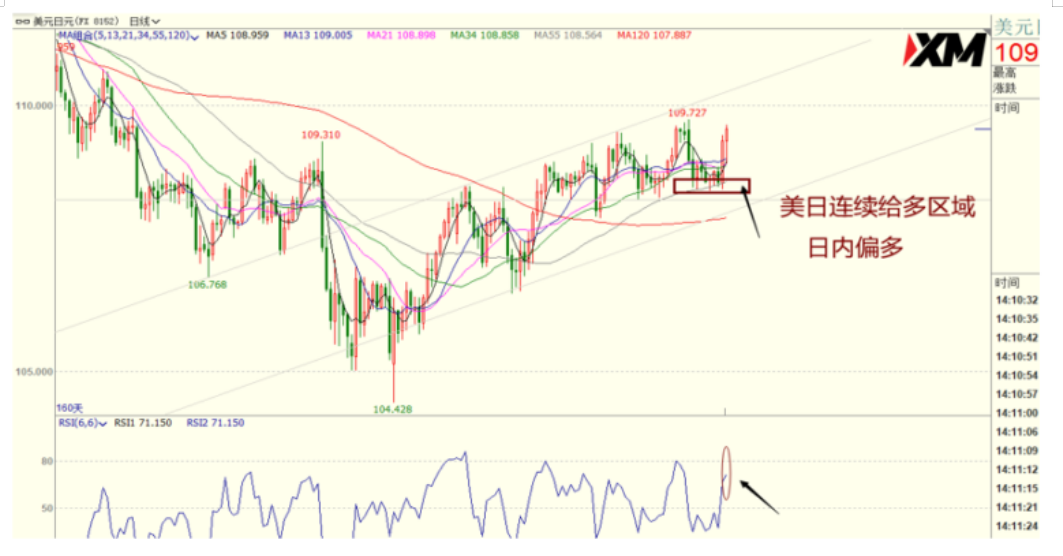 美日昨日在108.40支撑区域继续收阳,偏多运行,日内可继续回踩低多交易。
