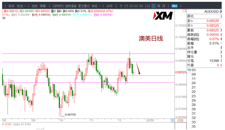 (2)澳美先跌, 0.6815多,止损0.6780,目标0.6855/0.6865.
