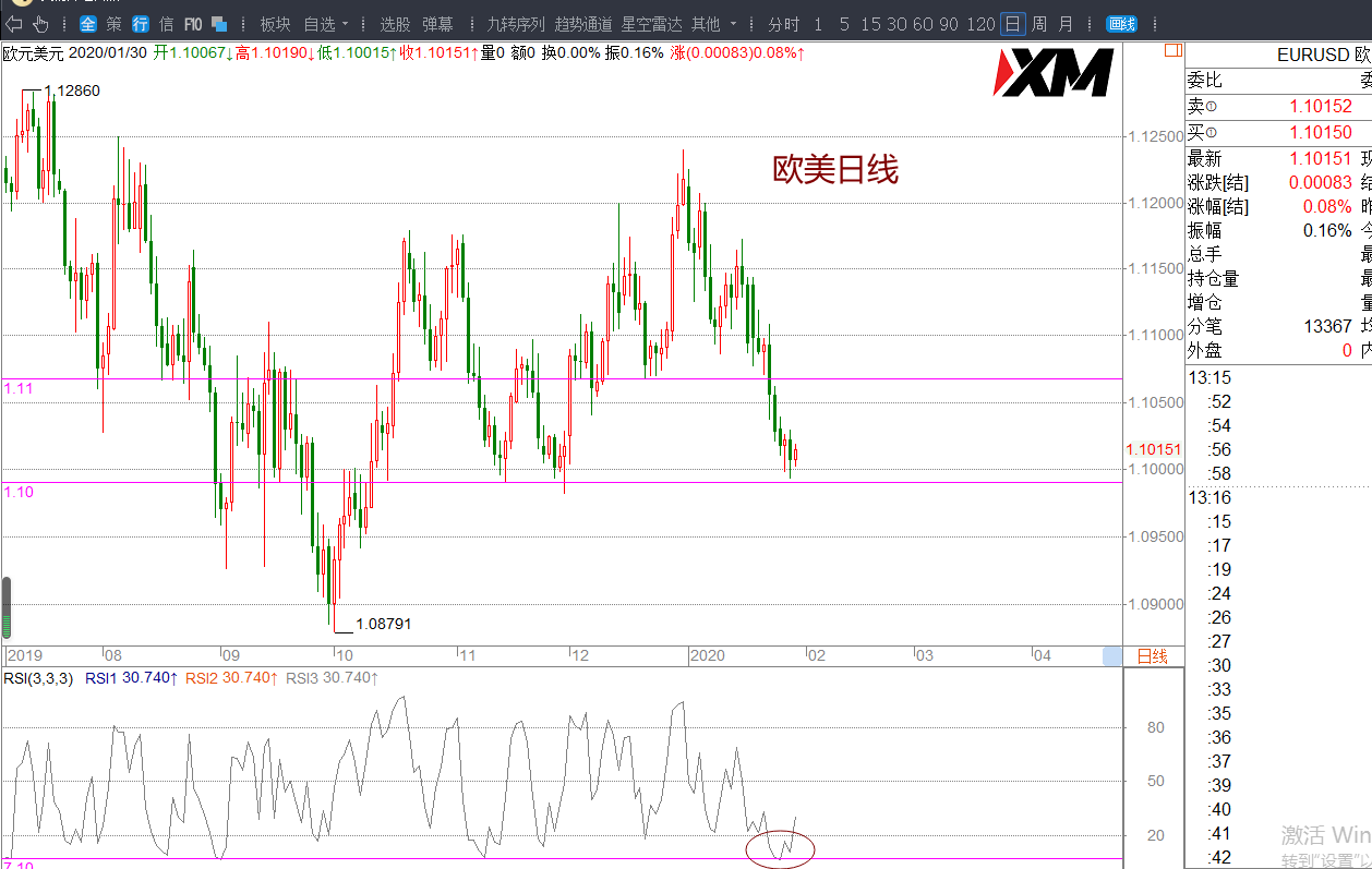欧美日线RSI指标低位,空间上到达前期劲线支撑,预估市场会出现小幅震荡,K线走势,1.1026/1.1030下方依然偏空运行。
