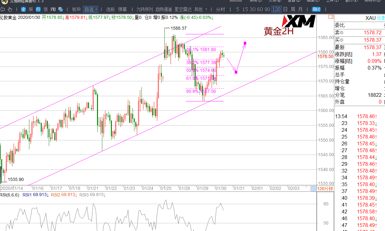 黄金昨日短级别看涨正确,日线强势收阳,1578一带的空单未能获利,今日择机保本或获利离场。黄金昨天的走势,符合2H级别的通道运行判断,今天继续看这个上涨通道运行做交易指导。