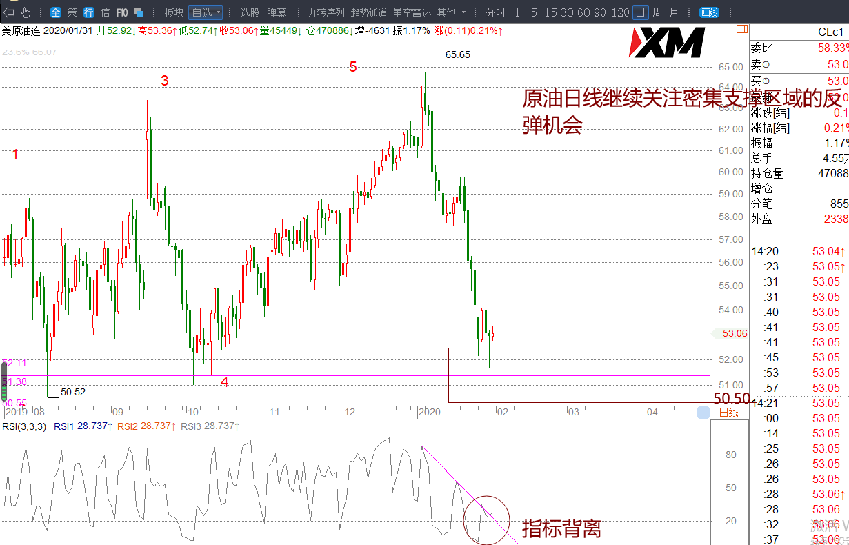 (1)原油日线上还是空头趋势,逢高进空都是首要选择。关注54.25下方的试空机会。