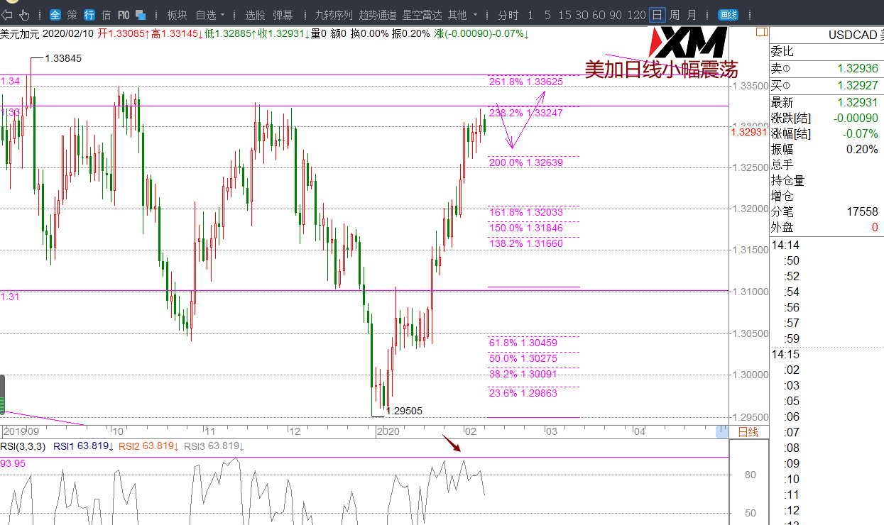 美加日线偏震荡运行概率,1.3340/1.3360下方有一定抛压,尝试短空,目标1.3280-1.3260一带。