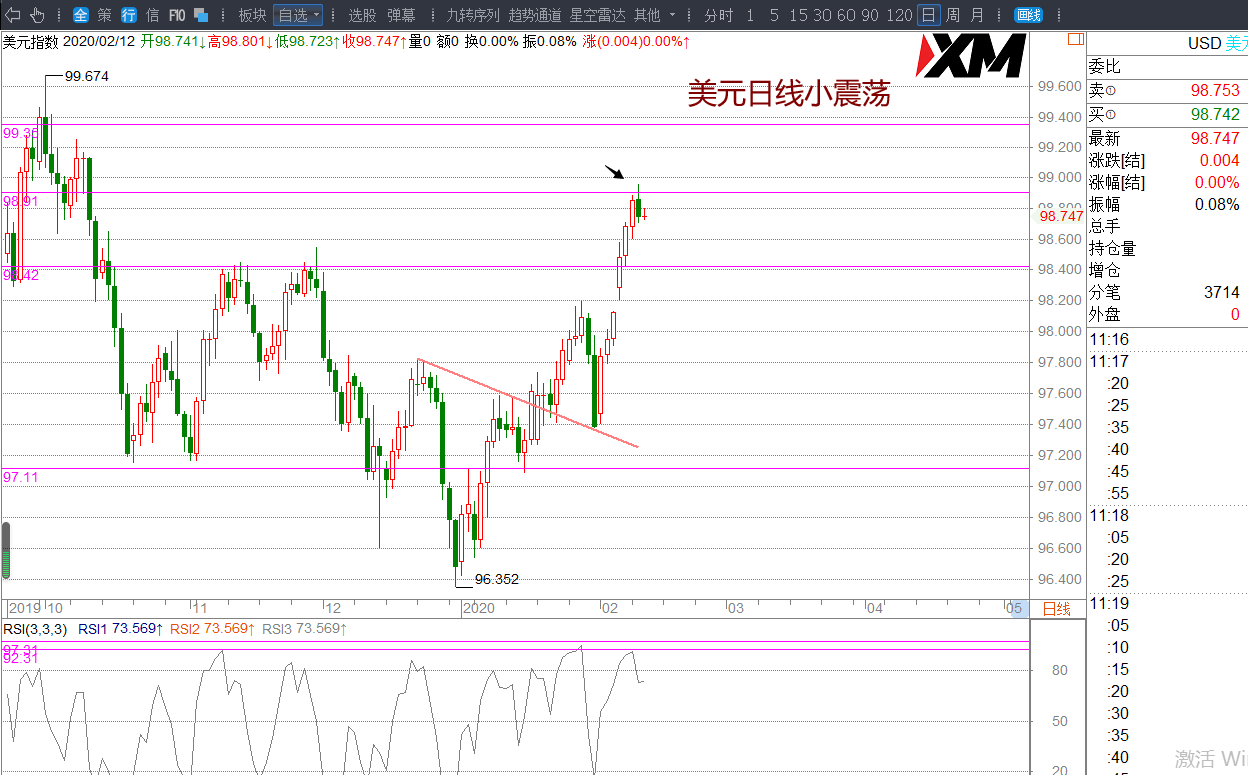 美元98.95未有效突破前,震荡运行。关注98.95-98.59区域。