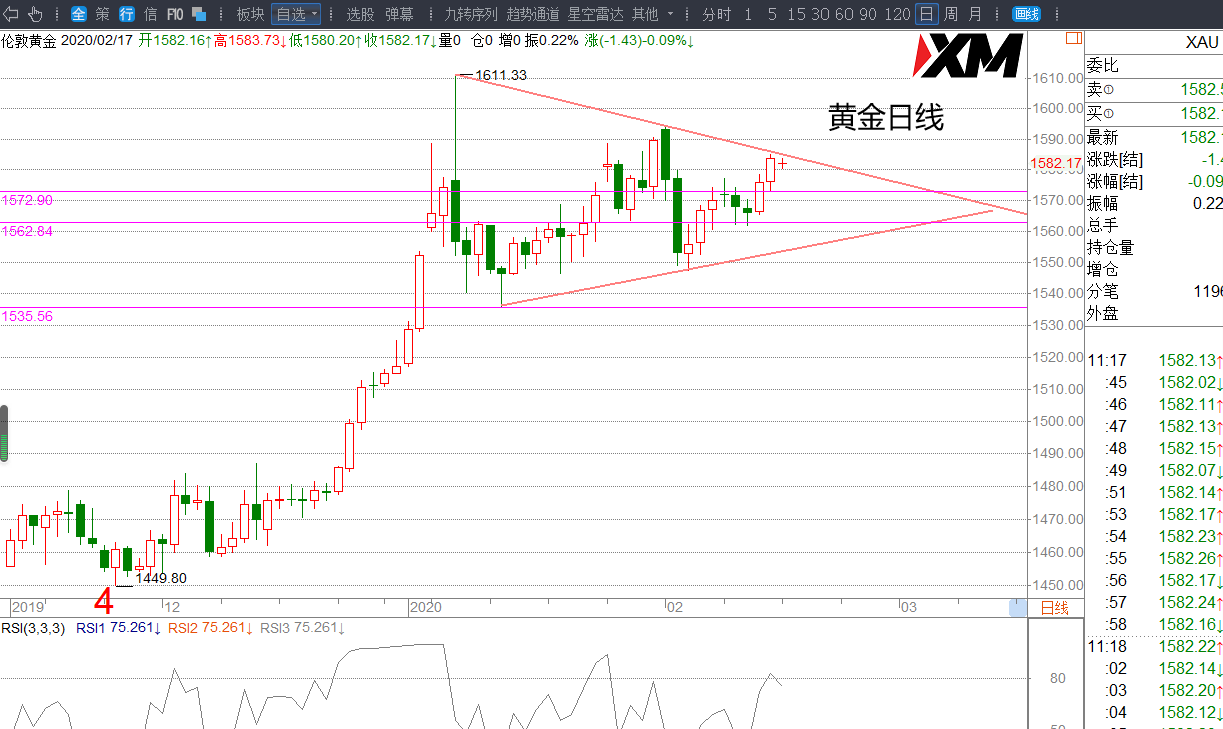 黄金上周五已如预期突破1578往上边缘上涨,日线收阳。今日关注黄金是继续上破三角形多头运行还是继续保持三角形走势。