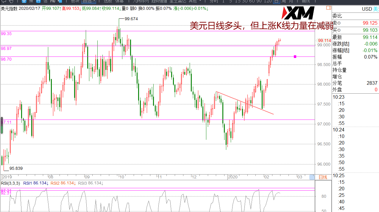本周等到回踩低多交易,日内关注回踩98.99位置多头趋势的保持,未明确回调前,保持多思路。