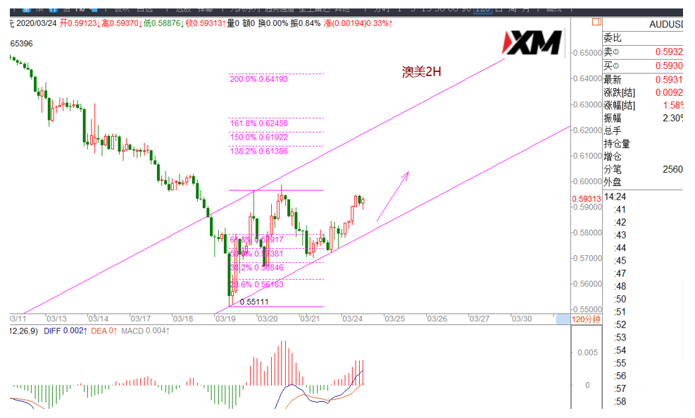 (2)澳美先跌,关注0.58-0.5790短多机会,止损0.5750,目标0.5880/0.59-0.5930