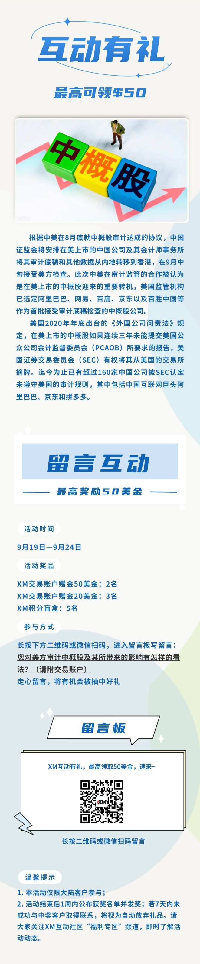 微信扫一扫海报最下方的二维码,参与XM互动留言,最高领取$50赠金,速来~