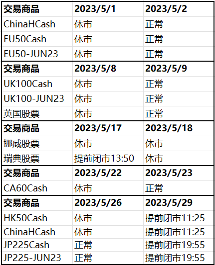 公共假日即将到来,部分商品的交易时间将于2023年5月1日 – 30日期间受到影响。