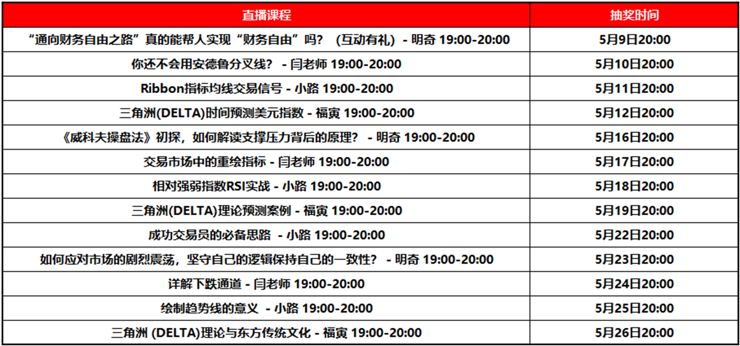 所有交易满1标准手的客户,还有机会获得端午惊喜礼盒!5月9日 - 31日期间,我们将在北京时间19:00-20:00的课程结束后进行13次在线抽奖,送出端午惊喜礼盒!公开、公平、透明!
