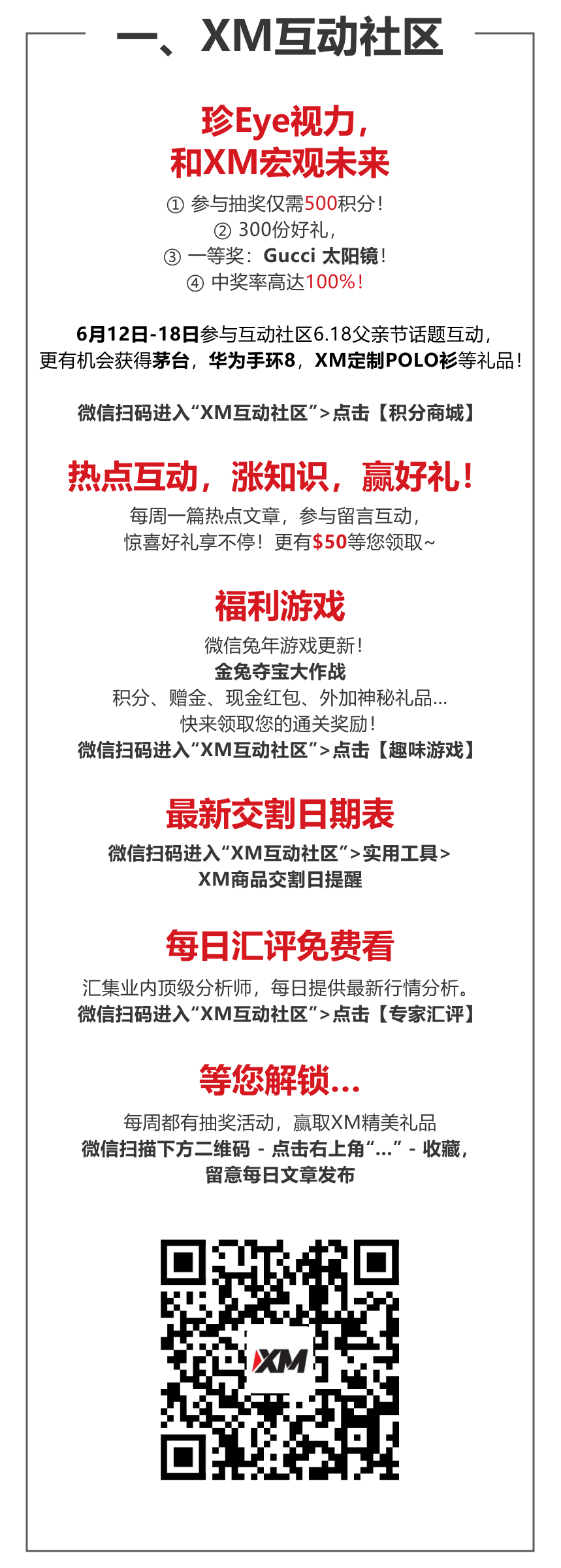 世界爱眼日, 一起珍Eye视力,和XM宏观未来!仅需500积分,即可享受100%中奖福利!一等奖: Gucci 太阳镜!参与6.18父亲节话题互动,更有机会获得 茅台,华为手环8,XM定制POLO衫等礼品~