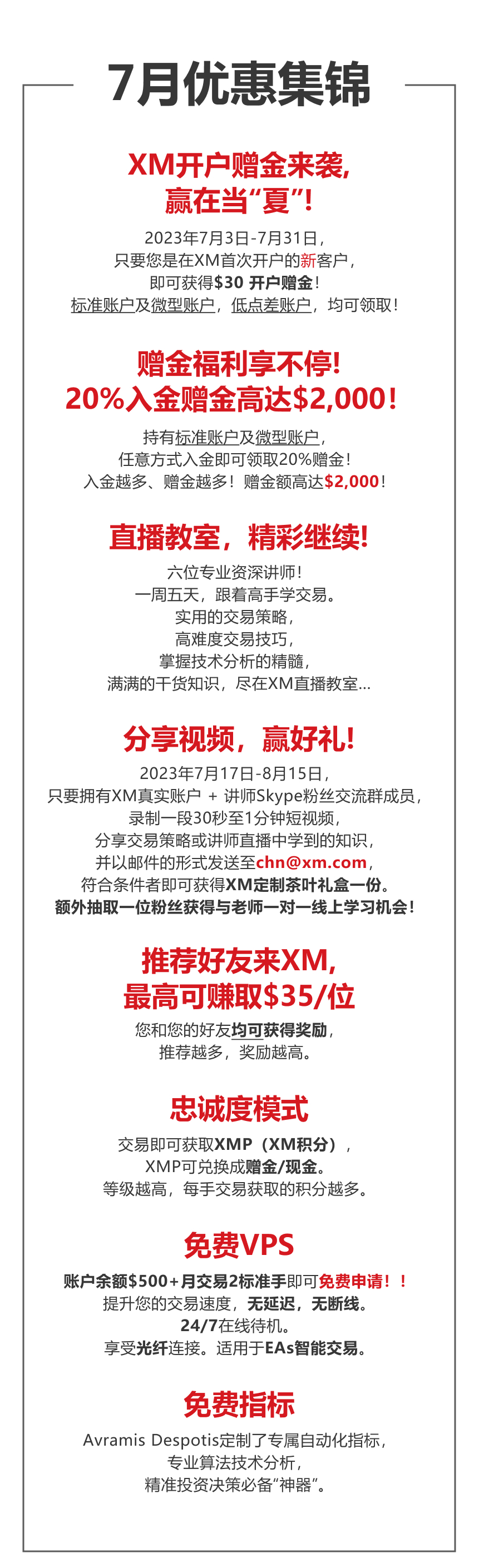 开户赠金,福利来袭!2023年7月3日 - 2023年7月31日,只要您是在XM首次开户的新客户,即可获得$30 开户赠金!标准账户、微型账户及低点差账户,均可领取!