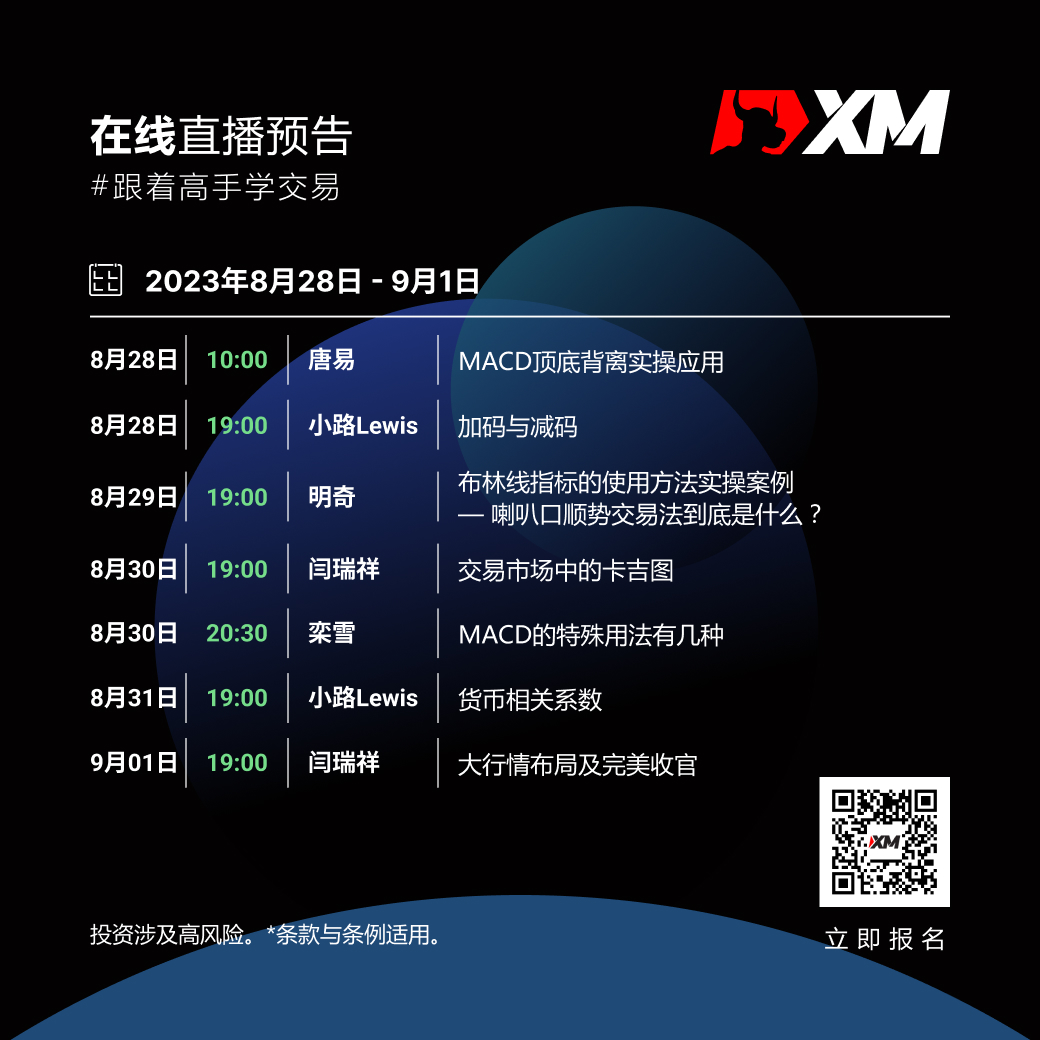 来到八月末,XM雷打不动的推出适合不同阶段交易者的直播课程。每周都有七节课,时间灵活,交易者可选择适合自己的课程,不用再担心交易场上犯迷糊。
