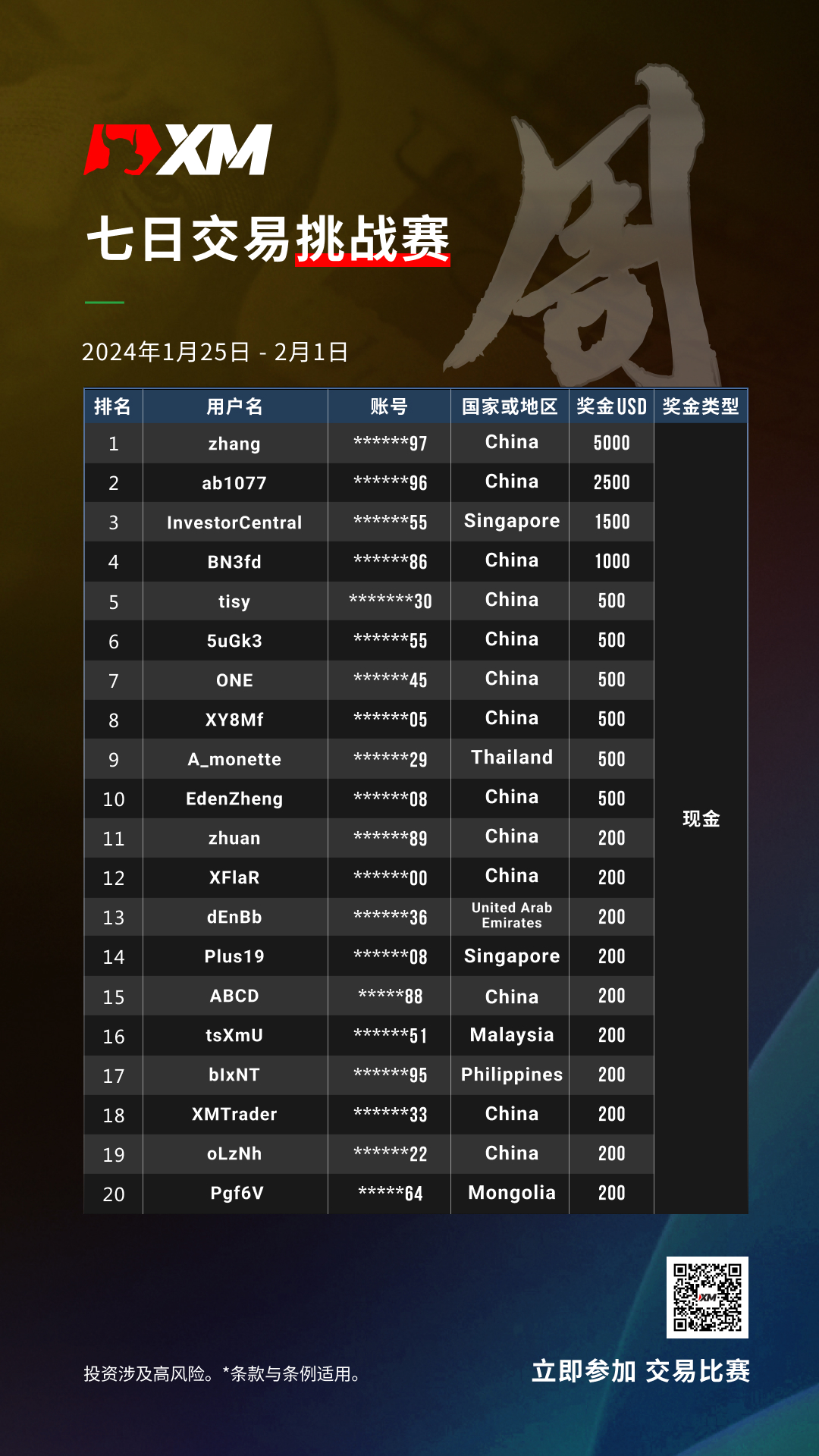 非常荣幸地宣布本次【七日交易挑战赛】的获奖者名单。参赛者不仅展现出卓越的交易技能,还表现出无与伦比的策略和决策能力。以下是本次比赛中,脱颖而出的交易者名单以及所获得的奖励:
