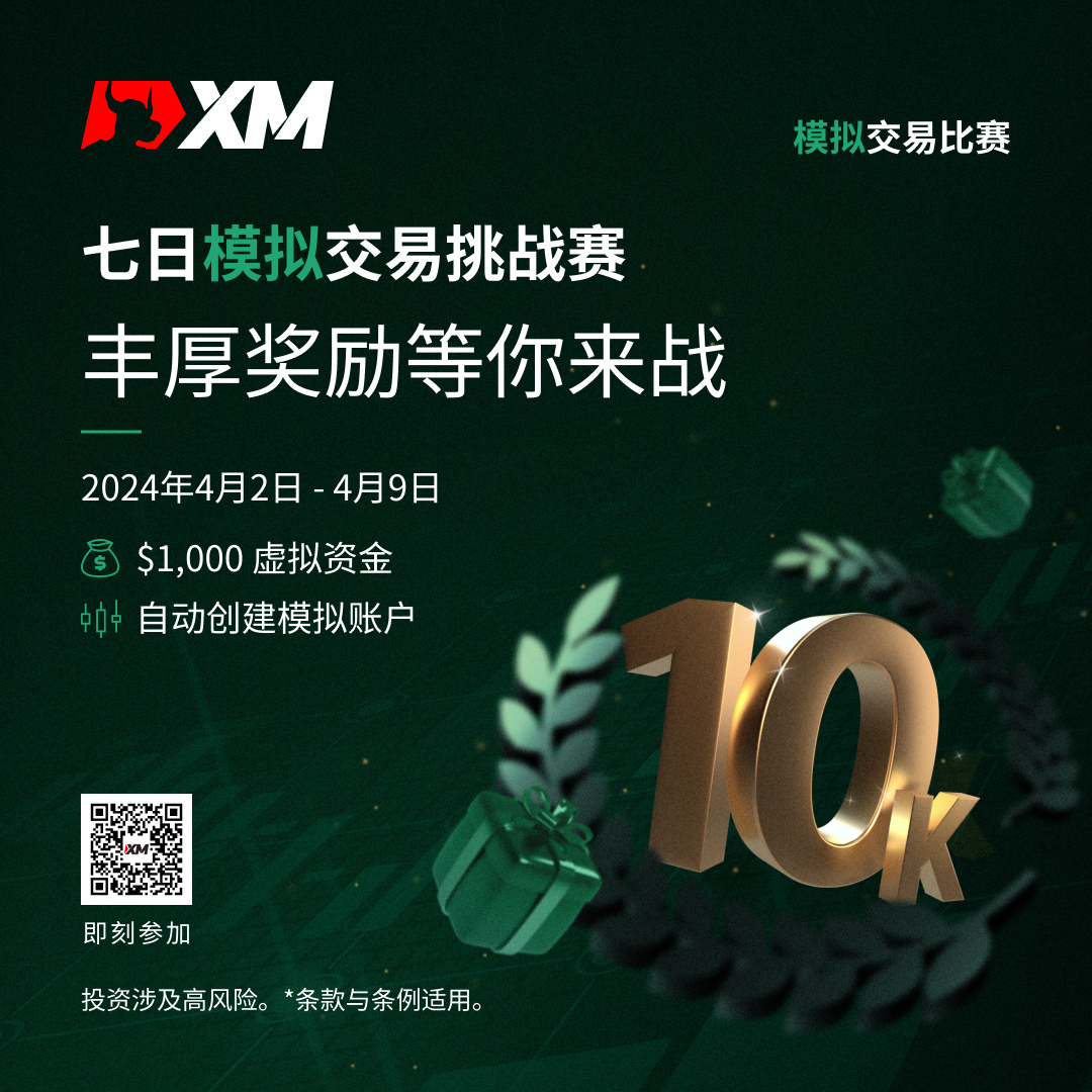 2024年04月02日至04月09日期间,报名参加XM模拟交易比赛,挑战自我,制定交易策略,瓜分总值 $10,000 美元 现金奖励!