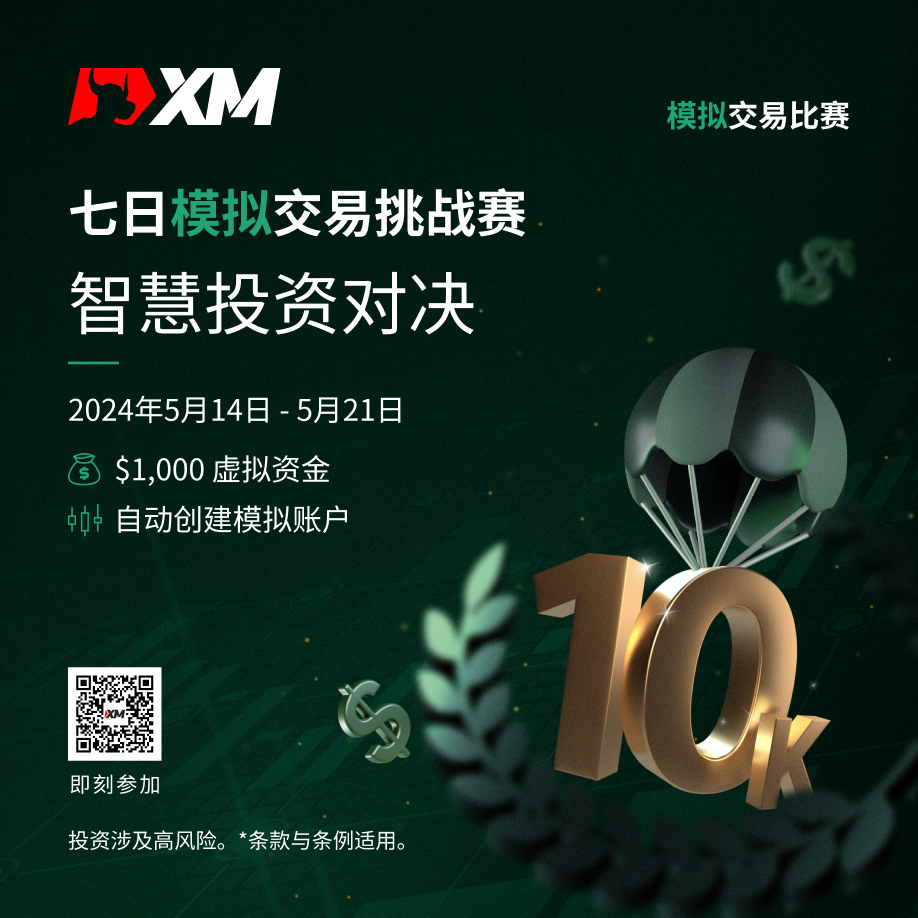2024年05月14日至05月21日期间,报名参加XM模拟交易比赛,挑战自我,制定交易策略,瓜分总值 $10,000 美元 现金奖励!