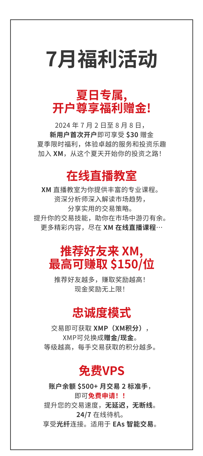 2024年7月2日至8月8日,XM为新客户推出夏日专属开户礼遇,首次开户即可获得$30赠金!不要错过这个机会,让这个夏天成为你投资旅程的起点!