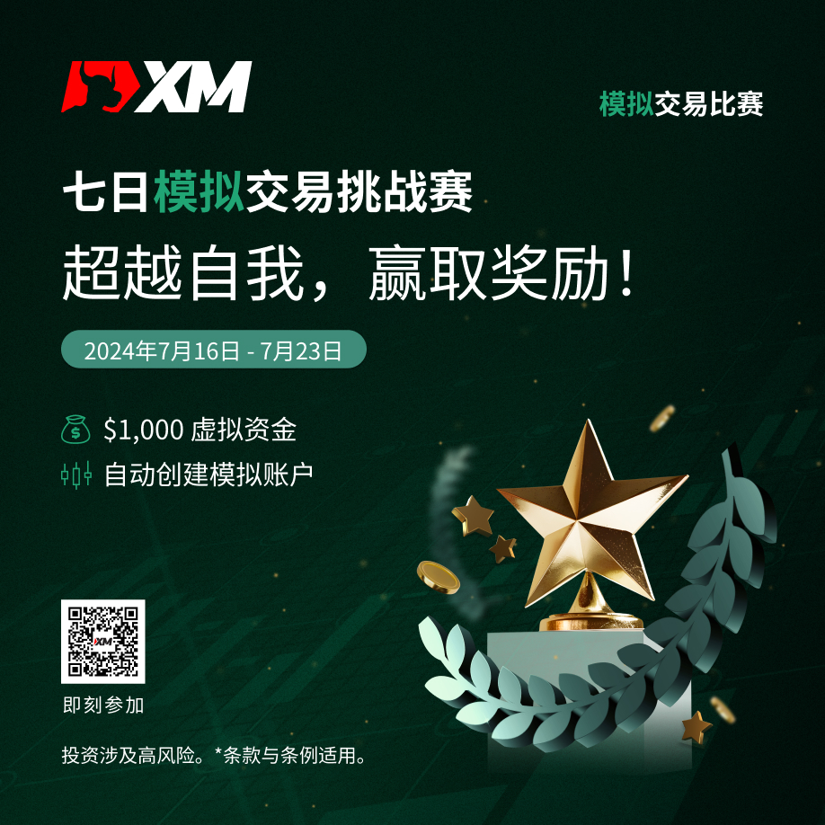 2024年7月16日至7月23日期间,报名参加XM模拟交易比赛,挑战自我,制定交易策略,瓜分总值 $10,000 美元 现金奖励!