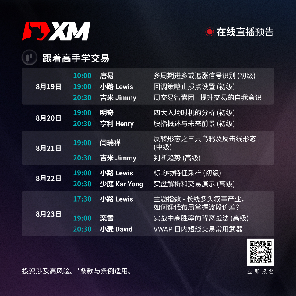XM中文在线直播讲座是一系列为交易员设计的学习讲座,旨在帮助初学者和经验丰富的交易员提升他们的交易分析和交易技巧。