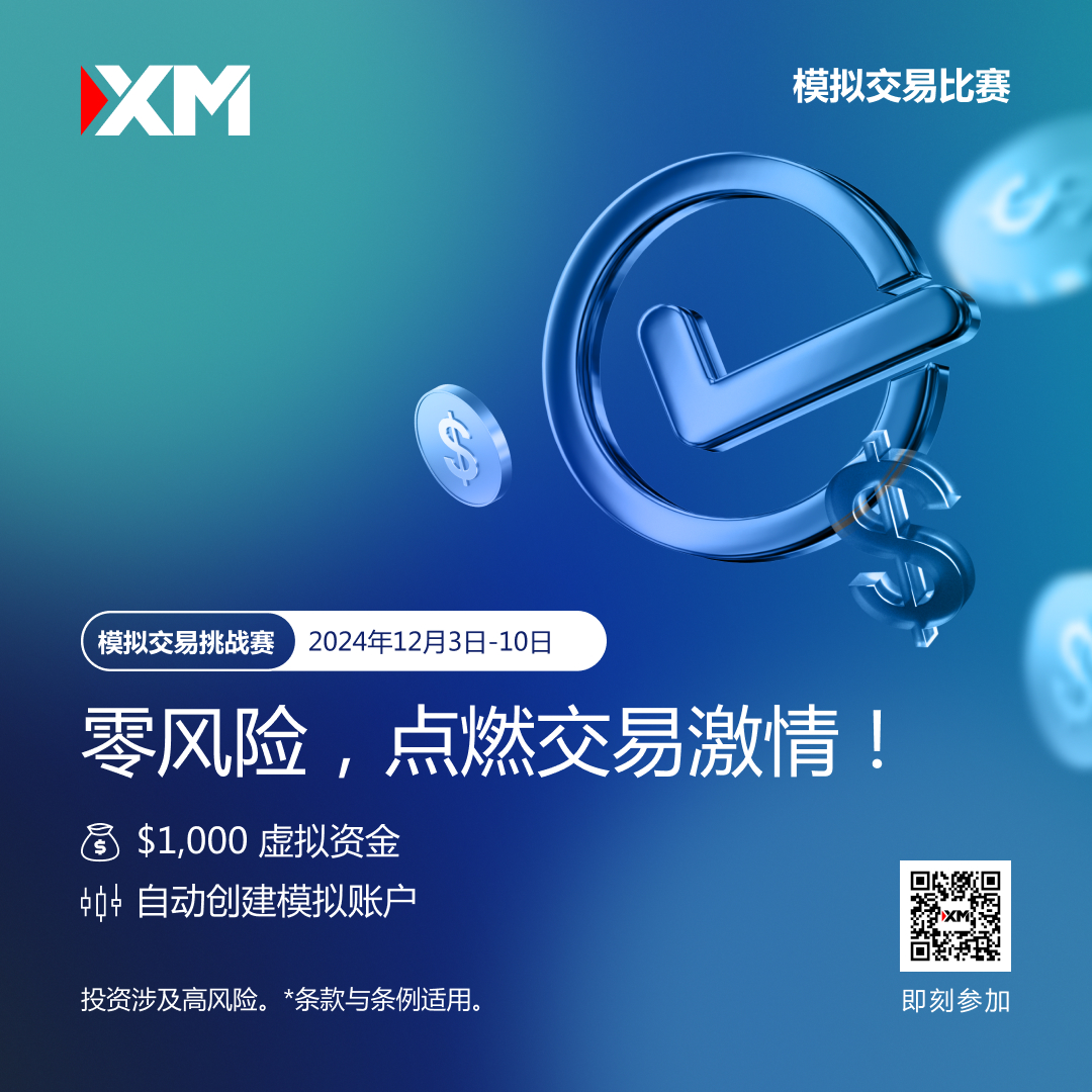 2024年12月3日至12月10日 期间,报名参加XM模拟交易比赛,挑战自我,制定交易策略,瓜分总值 $10,000 美元 现金奖励!