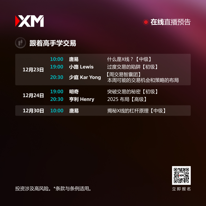 XM为你带来 4节精选在线直播课程!由资深讲师精心打造,内容聚焦关键交易技巧,助你在节日中稳步提升交易能力,把握市场机会。