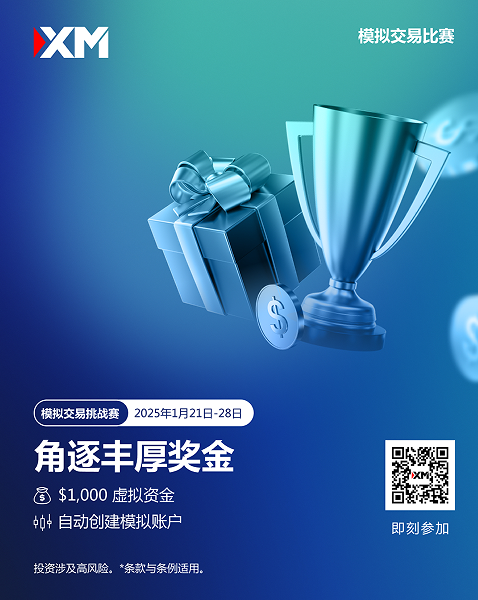 2025年1月21日至1月28日 期间,报名参加XM模拟交易比赛,挑战自我,制定交易策略,瓜分总值 $10,000 美元 现金奖励!