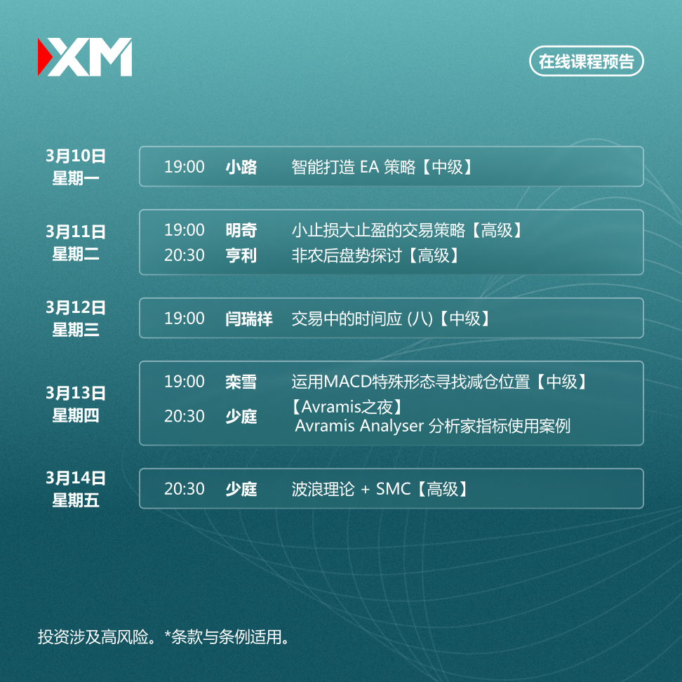 每周一至周五,参加由 XM 金牌讲师们精心设计的投资课程,让你在交易路上如虎添翼。