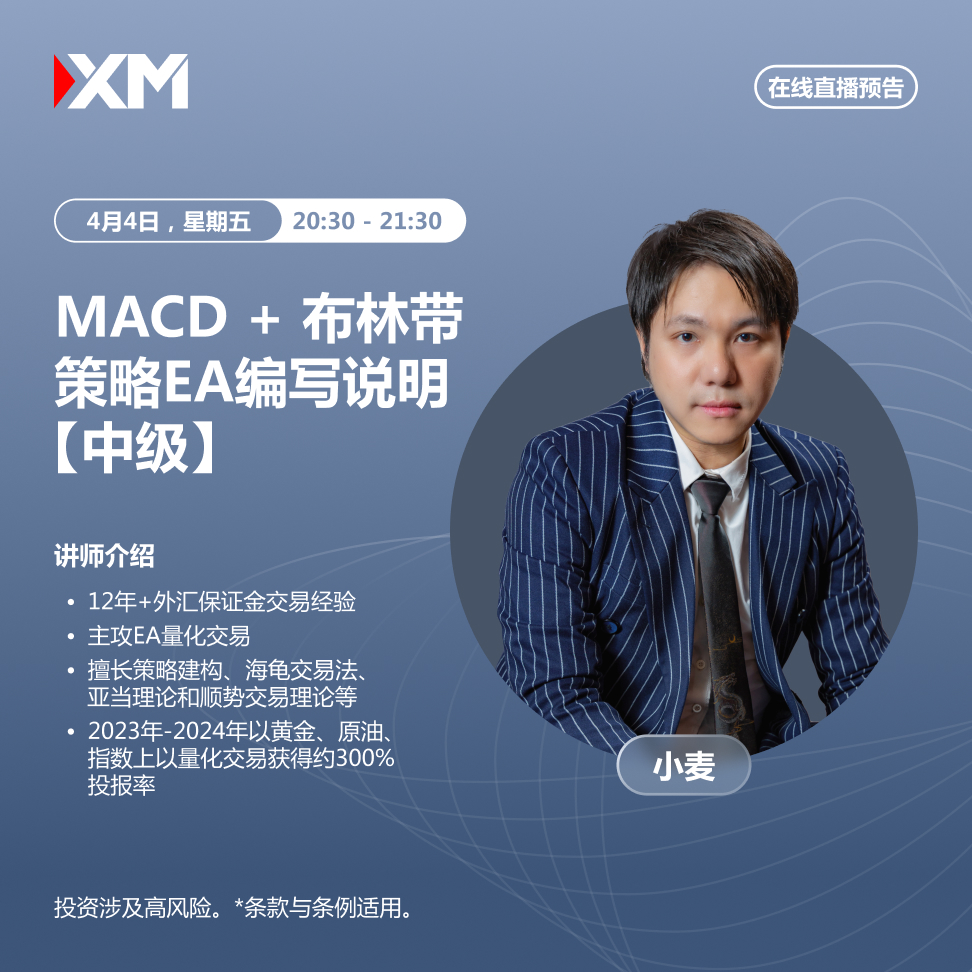 今晚,北京时间 20:30,小麦老师将说明MACD+布林带策略EA编写说明【中级】。直播内容包括: