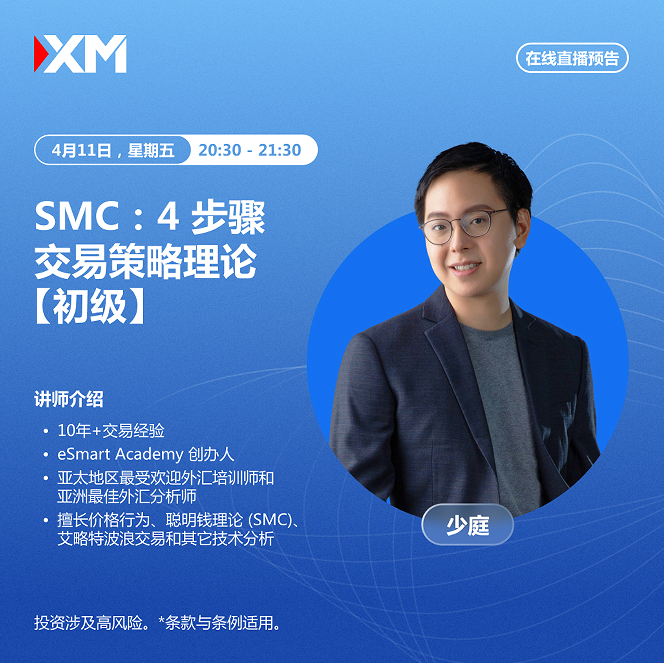 今晚,北京时间 20:30,少庭老师将说明SMC:4 步骤交易策略理论【初级】。直播内容包括: