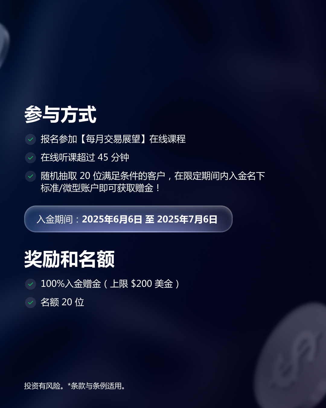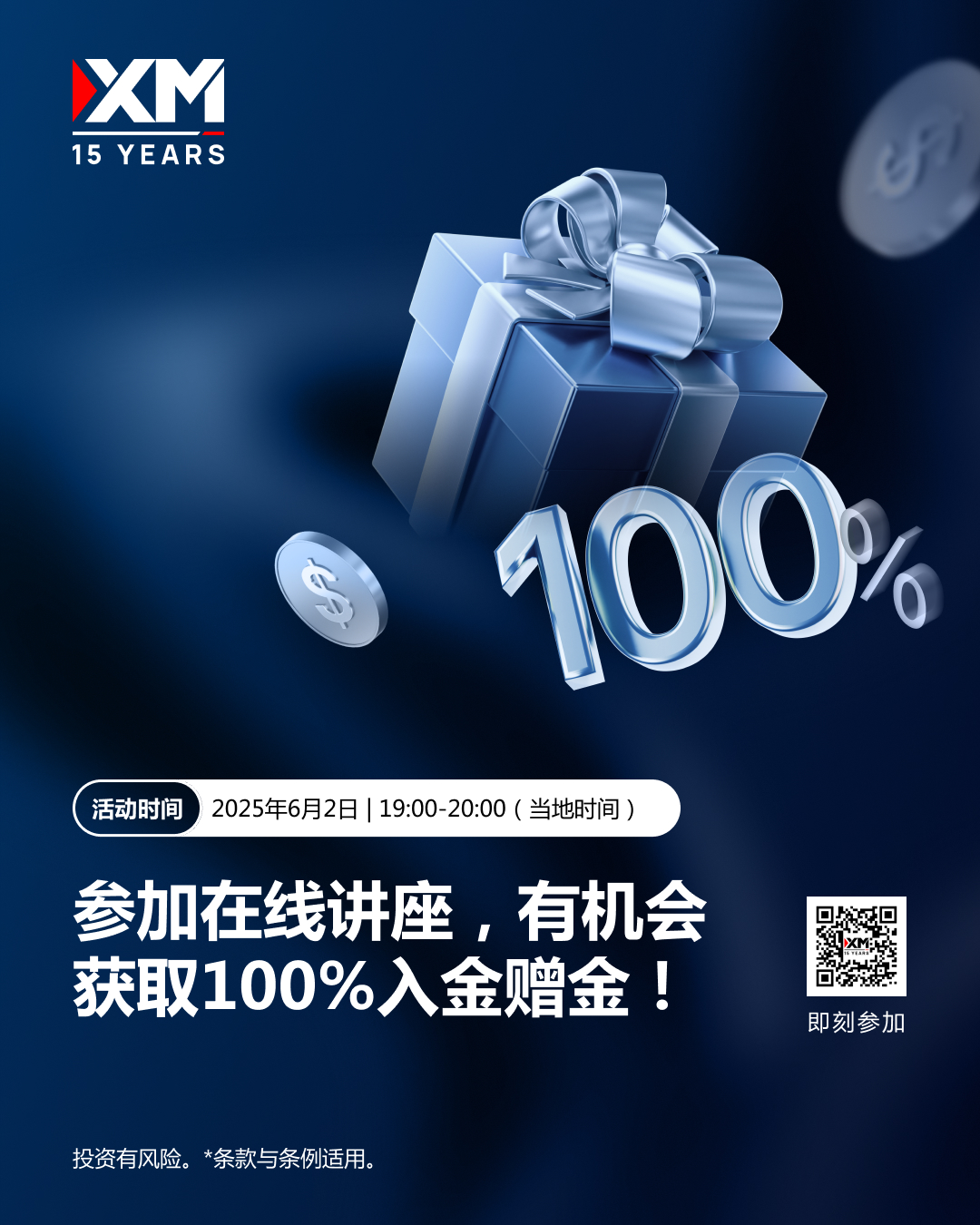 2025年6月2日,报名参加 XM【每月交易展望】在线课程,带你掌握6月市场脉动与交易重点。只要报名并在线听课超过45分钟,即有机会获得100%入金赠金的幸运名额 ,让学习成果立刻转化为实战助力!